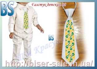 [АКЦІЯ] Краватка дитяча, вишивка бісером, атлас, "Жовто-зелений орнамент" (біле тло)