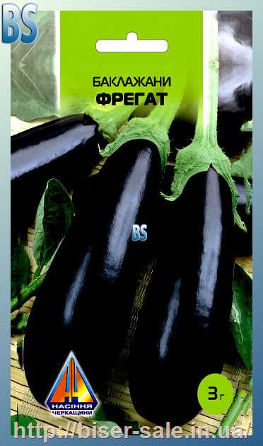 Баклажани Фрегат (0.5г), ранньостиглий, кущ висотою 0,4-0,6м, плоди масою 130-150г